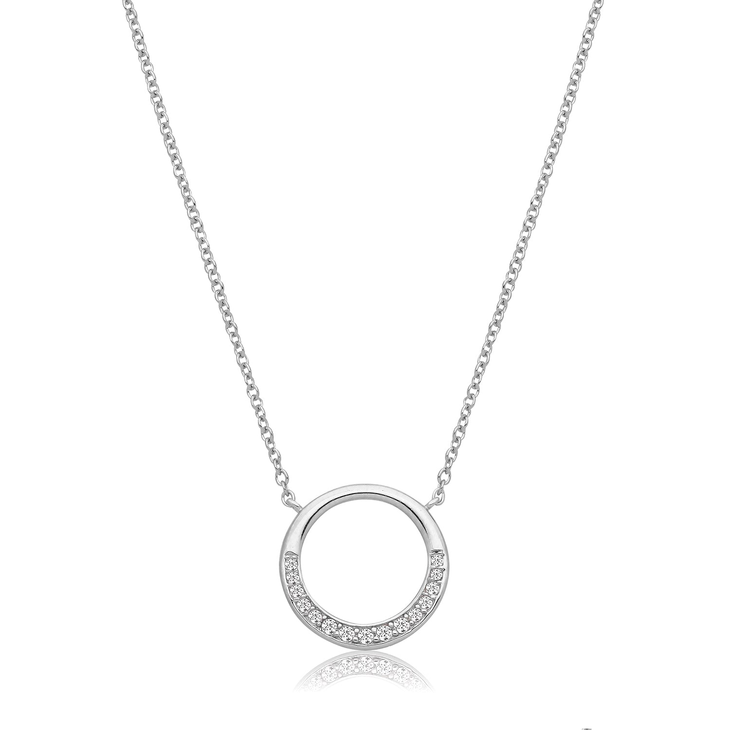 Sophisticated and modern, this Sterling Silver Partial Set Halo Circle Pendant is a timeless addition to any jewellery collection. Crafted from high-quality sterling silver and rhodium plated for a lasting shine, the pendant features a sleek circular design with the bottom half elegantly adorned with sparkling cubic zirconias. The contrast between the polished silver and the shimmering stones creates a refined, minimalist look. Suspended from a fine fixed chain, this pendant is perfect for effortless everyday elegance or special occasions.