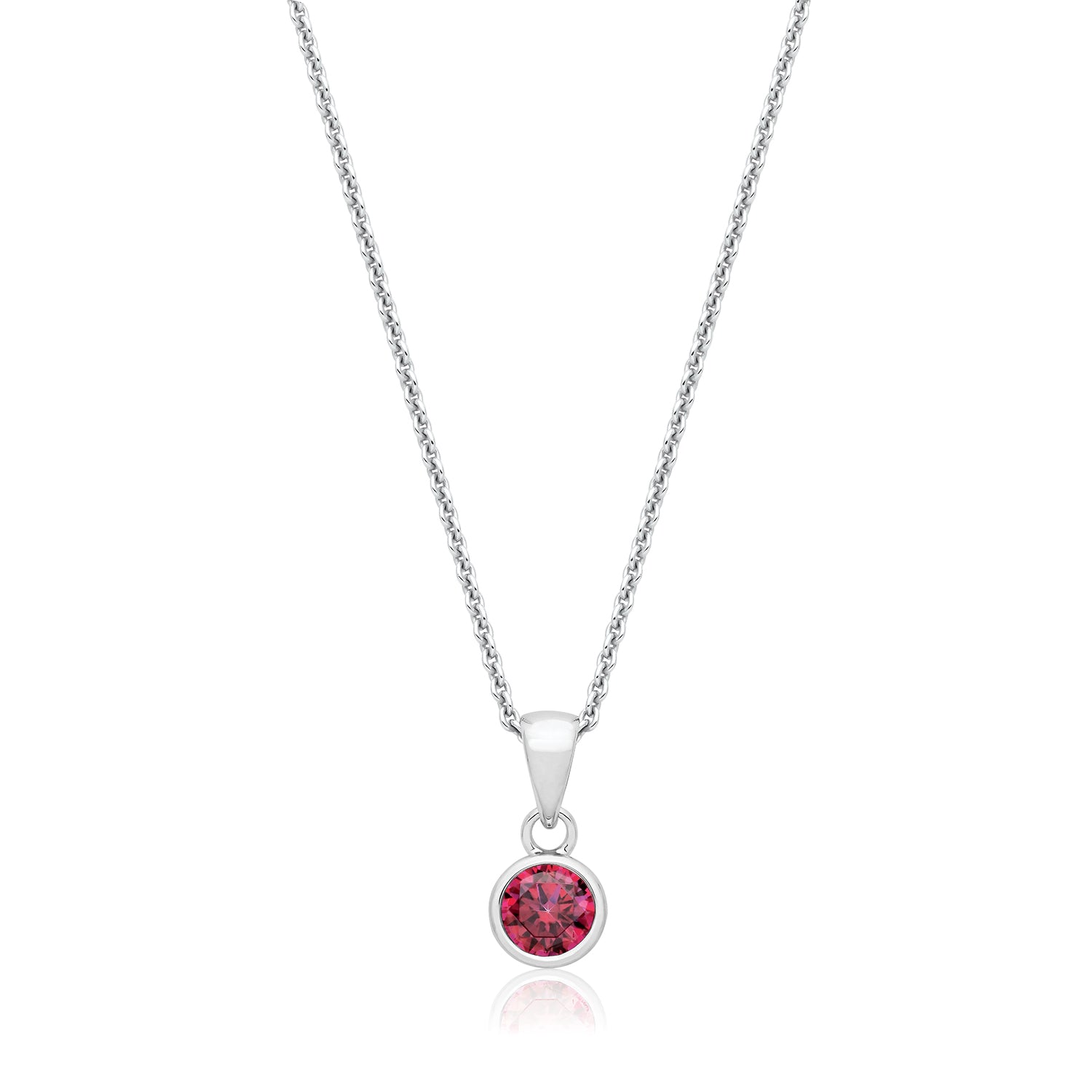 This radiant Cubic Zirconia Pendant is inspired by the fiery beauty of rubies. Featuring a vibrant ruby-red cubic zirconia gemstone in a secure rub-over setting, this pendant exudes timeless elegance and passion. Suspended from a sleek V-loop and paired with a fine rhodium-plated silver chain, this piece is the perfect blend of sophistication and versatility. A meaningful gift or a striking addition to your own collection.