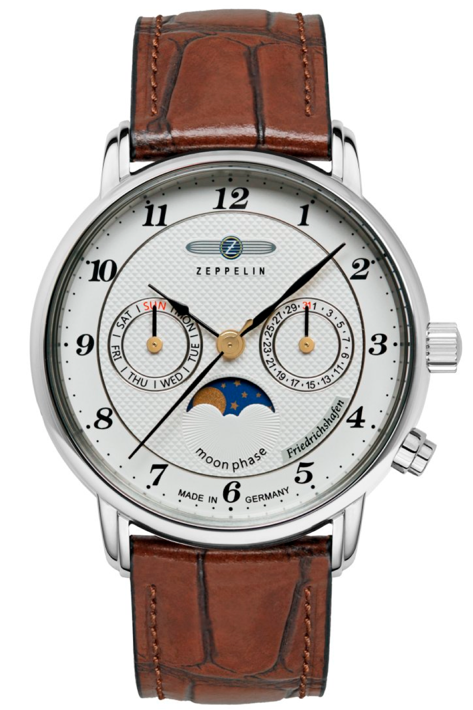 The watch is complemented by a brown leather strap, which adds warmth and a classic touch to the overall design. Crafted in Ruhla, Germany, this piece showcases Zeppelin’s commitment to quality and in-house production.