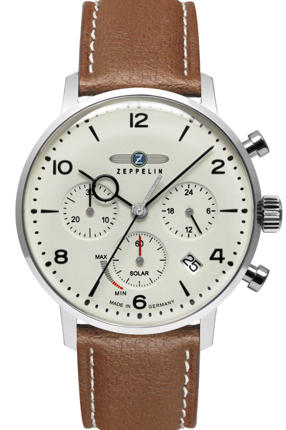 The Zeppelin solar chronograph offers a sophisticated design paired with sustainable innovation. Featuring a refined beige biopolymer dial with silver numerals and indices, this timepiece is powered by the eco-friendly Japanese Seiko VR42A solar movement, providing precision and eliminating the need for battery replacements.