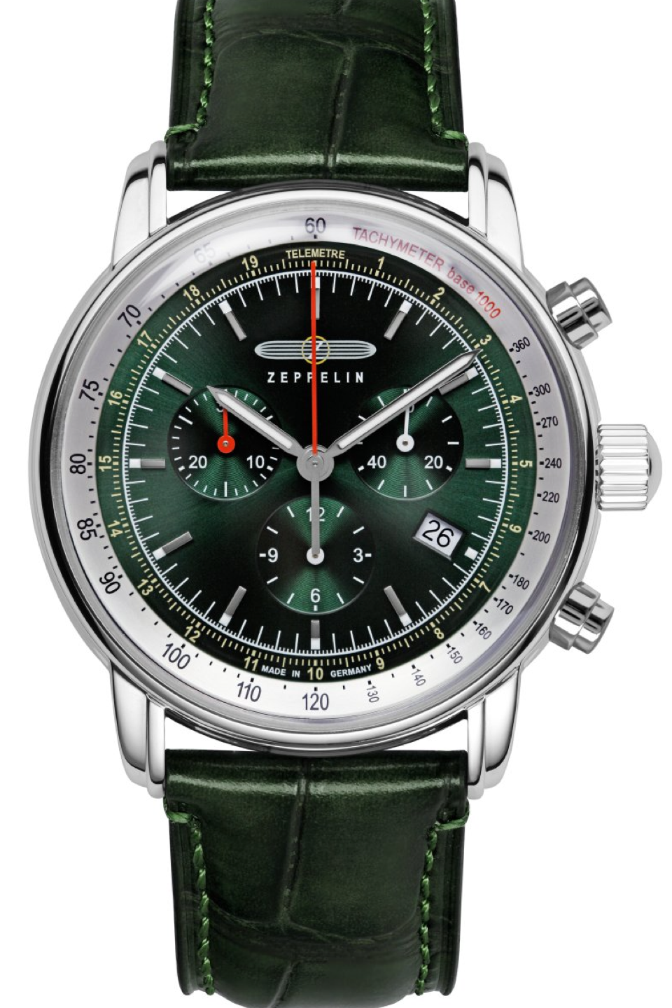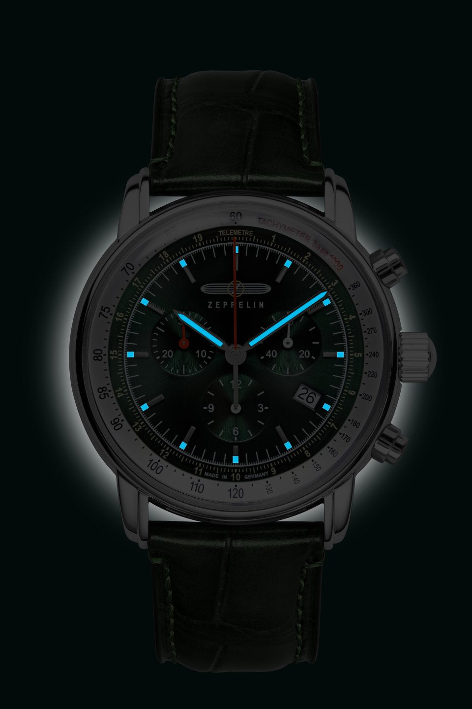 The Zeppelin men's quartz chronograph combines robust performance with a refined design, perfect for the modern gentleman. Featuring a striking dark green dial, this timepiece is enhanced by silver night-glow numerals and indices, as well as luminous hands for effortless readability in any lighting condition. Encased in durable stainless steel, the chronograph functions are seamlessly integrated, offering precision timing with a stylish, understated appeal.