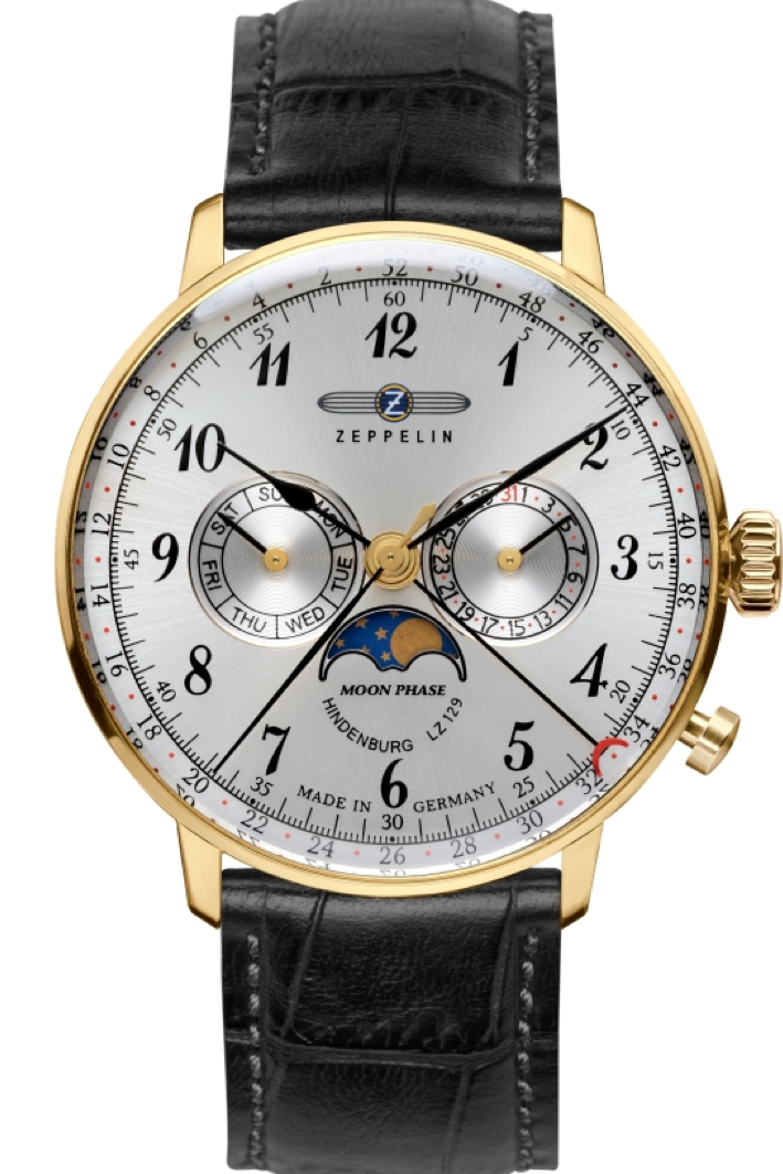 The genuine leather strap complements the watch's timeless design, offering comfort and durability for everyday wear. The dial's refined markers and hands, along with the moon phase display, make this watch a perfect blend of style and functionality. Water-resistant up to 50 meters, this Zeppelin watch is as durable as it is stylish, suitable for both formal events and casual outings.
